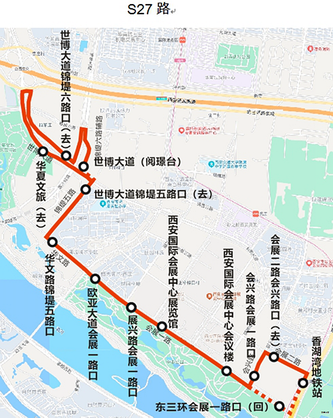 线路设置站点13个:世博大道(阅璟台)、世博大道锦堤六路口(去)、华夏文旅(去)、世博大道锦堤五路口(去)、华文路锦堤五路口、欧亚大道会展一路口、展兴路会展一路口、西安国际会展中心展览馆、西安国际会展中心会议楼、会兴路会展一路口、会展二路会兴路口(去)、东三环会展一路口(回)、香湖湾地铁站。