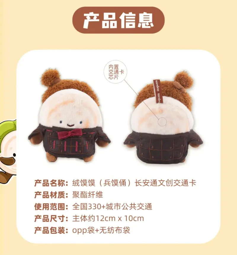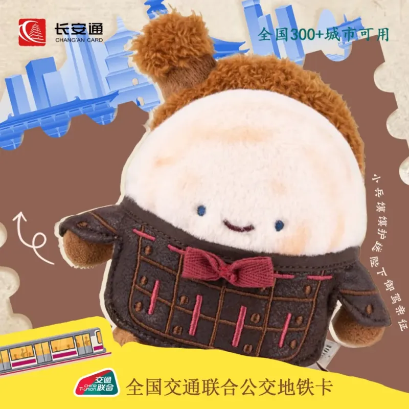 作为西安本土风味与历史元素的创意碰撞,长安通与绒馍馍联名的文创交通卡,堪称今年春节最具特色的“萌系伴手礼”。以陕西特色美食肉夹馍为原型,圆滚滚的“馍身”融合兵马俑元素,头顶俏皮“发髻小揪揪”,身披秦俑铠甲,13厘米的身高,刚好一手掌握。它既是可爱的挂包小配饰,更是可畅行全国330余城市的交通联合卡,让“馍都”专属的萌趣,伴随每一次出行走遍大江南北。
