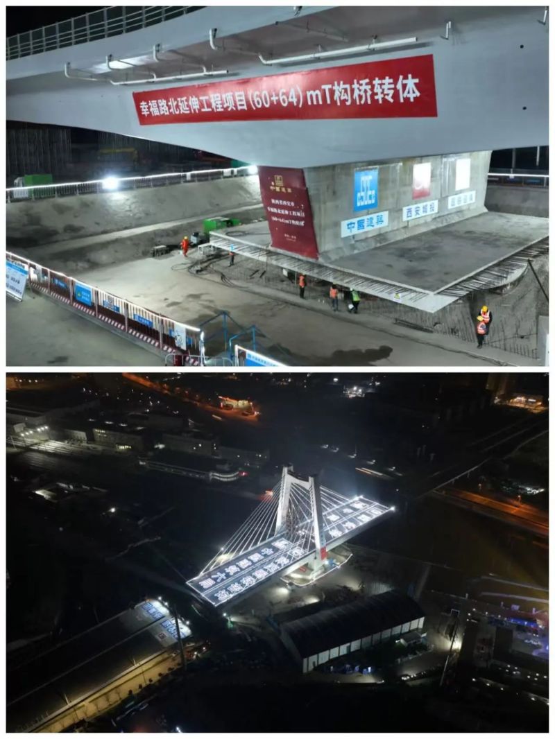 在幸福路北延伸工程实施中,最值得一提的就是两次“华丽转身”,即刷新多项国内之最的(60+64m)T构桥转体与上跨陇海铁路(80+90m)独塔斜拉桥转体。其中,T构转体桥为国内最宽单墩双幅T构转体桥,总重2万吨,于去年12月18日完成85°转体;而独塔斜拉转体桥转体重量达4.8万吨,为目前国内转体重量最大的多向不对称斜拉桥,于今年3月8日完成69.45°转体,轴线偏差仅0.8毫米,实现转体桥与引桥部分毫米级精准对接。这两座桥梁的成功转体,展现了我国桥梁建设技术的世界级水平。